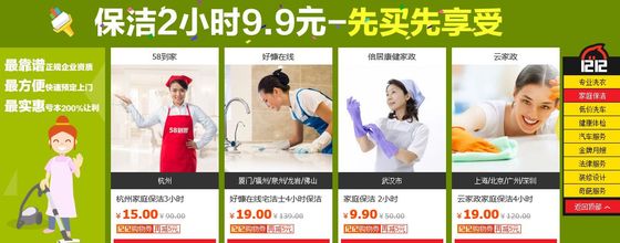1212では27の都市でクリーニング配達サービスを実施します。ダウンジャケットだけでなく、コート、セーターも9.9元で利用可能です。そして家の掃除も任せることができます、なんと一時間で5元しかかかりません。 また5元から自分専属の弁護士や、お手伝いさんを雇えることもできます。12月12日当日、弁護士、家政婦サービスや家電修理サービス、告白のお手伝い等、想像できないような異質なサービスもたくさん予定されています。
