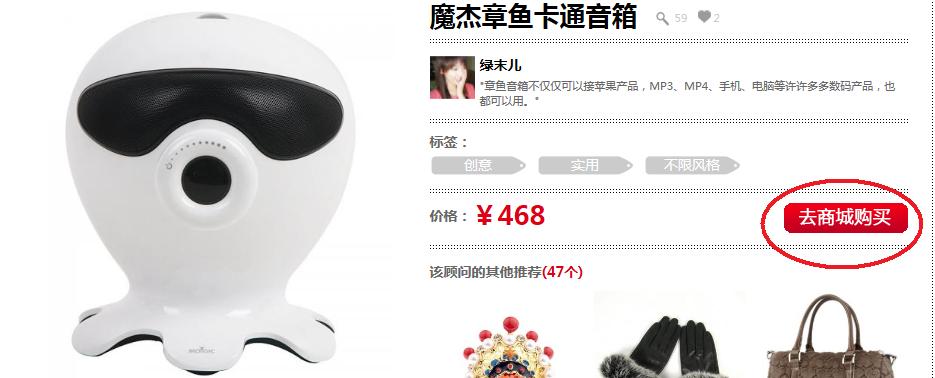 友達の誕生日ためにギフトを購入する例として、 ホームページにある指定条件欄で順番に出てくるキーワード(男 彼氏 25〜35歳 401〜700元 誕生日 アイデアある商品特徴)を選択すると、 ページ下にその指定条件通りに、面白いギフト商品が並んできました。 キーワード入力は一切なし、マウスでクリックし選択するだけですぐに目的のギフトが検索できます。 お薦めの商品を求める場合は、右側「求推薦」ボタンをクリックするだけです。 例えばタコキャラクターのミニスピーカーを選べば、タオバオの「天猫モール」にある商品ページに直リンクでアクセスができます。